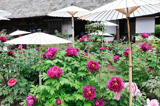 茂原牡丹園は里山を利用した回遊式庭園で、4月下旬から5月上旬にかけて約200種、2,000株の牡丹が咲き誇ります。同じ時期に開花するシャクヤクやツツジも見ごろを迎えます。