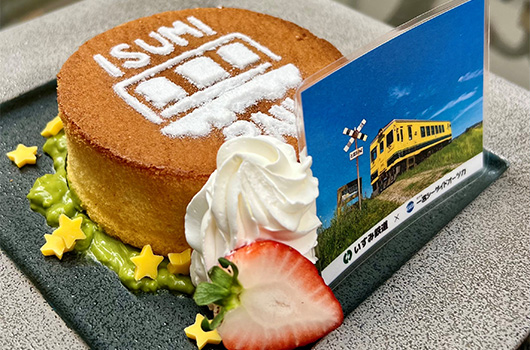 期間中は1階の喫茶コーナーで、いすみ鉄道とのコラボメニューを販売します。沿線の菜の花と里山の星空をイメージしたスフレケーキに、全4種類の記念プレートをランダムで1枚ご用意します。